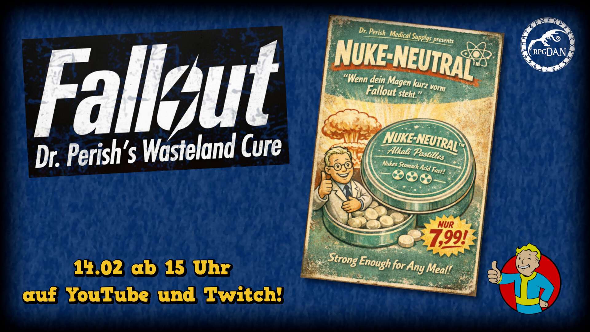 DAN GEHT WIEDER LIVE! FALLOUT Rollenspiel - Dr. Perish's Wasteland Cure |Live Actual Play Samstag 14.02 ab 15 Uhr auf YouTube und Twitch! > https://www.youtube.com/@rpgdan > https://www.twitch.tv/derrpgdan