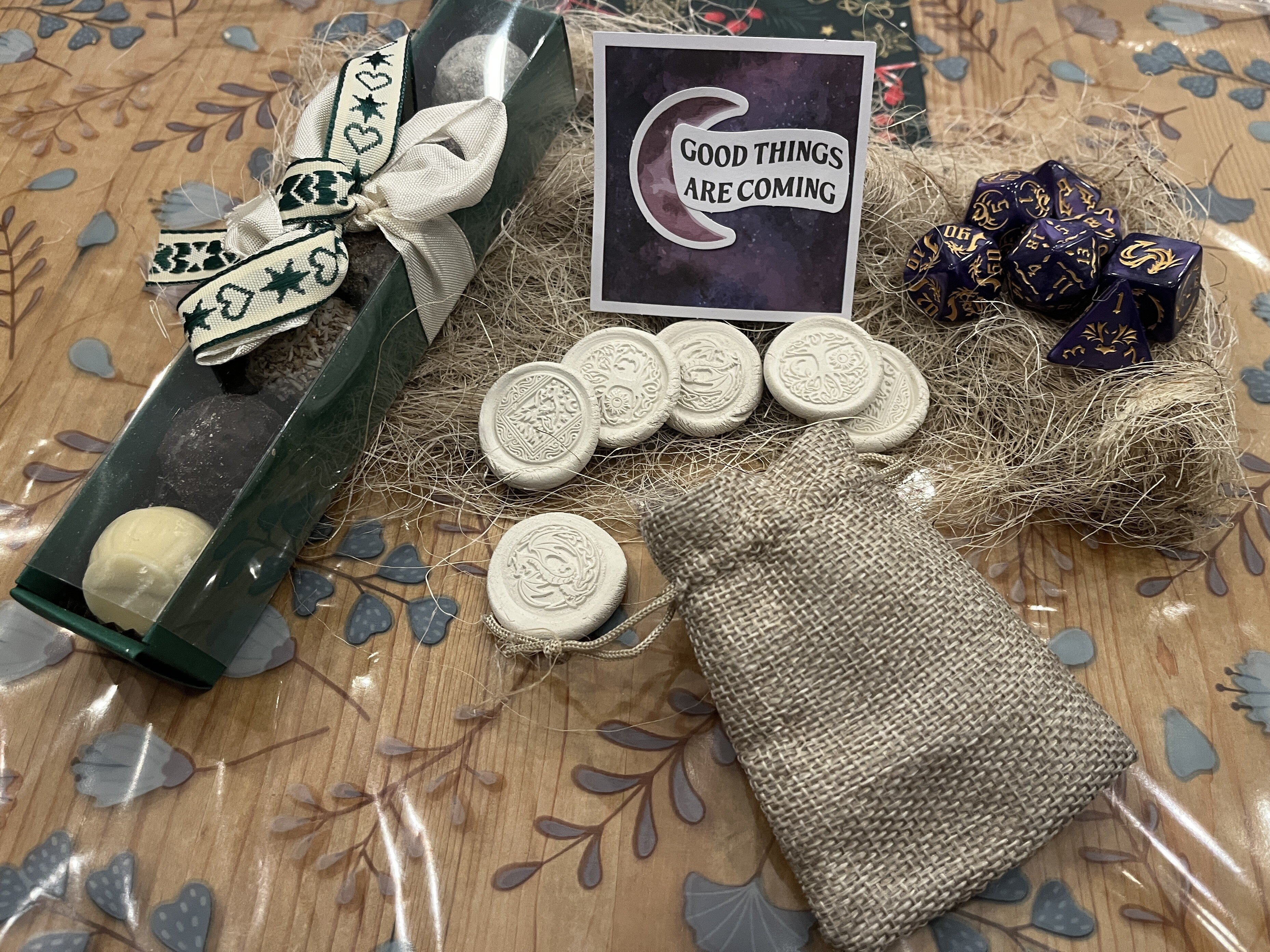 Hallo zusammen, ich habe gestern Nacht auch meinen Wichtel geöffnet! Vielen lieben Dank - die Glücksmünzen und die Würfel werden der neue Schrecken meiner Spieler und die Pralinen werden direkt auf die Hüften gehen! Danke!