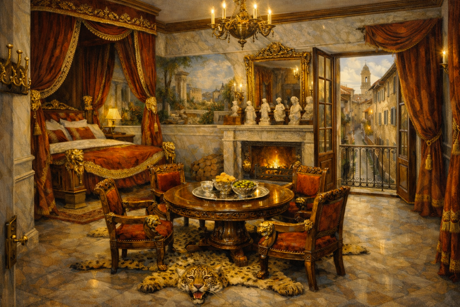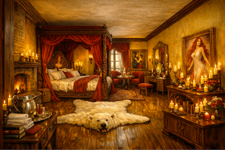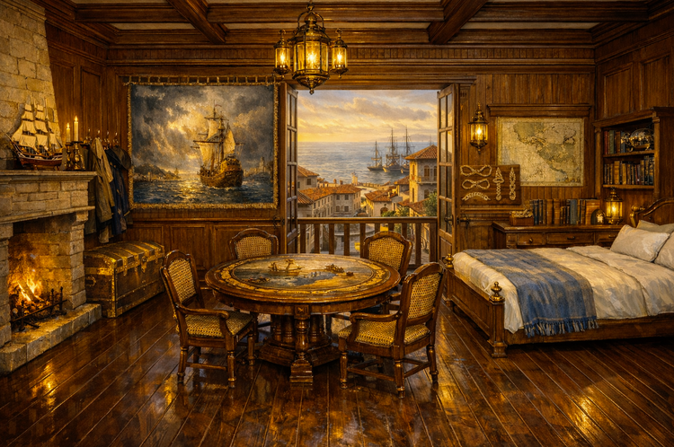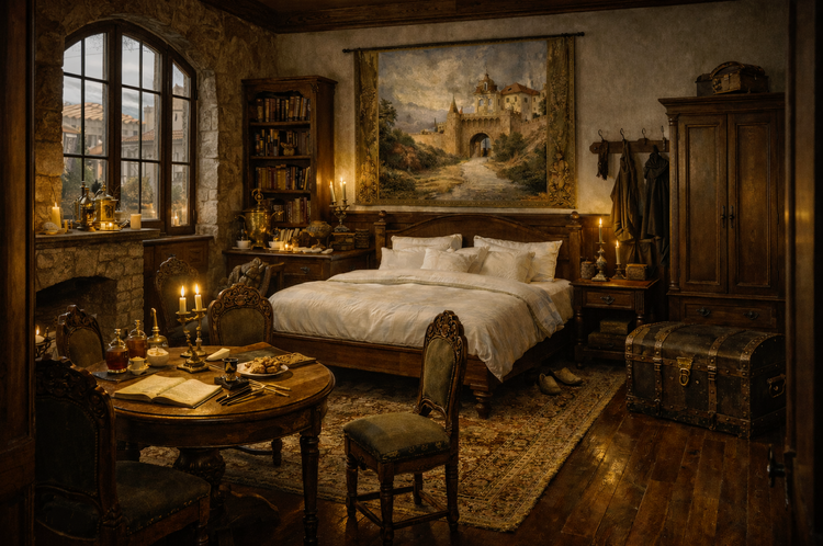 Ich habe mir eben mal ein Filmchen bei Youtube über DA angesehen. Schon beeindruckend, jedoch... ... diese Art von Tools wählt stets aus einem (wenn auch umfangreichen) Set von bestehenden Optionen aus. Ich kann also gerade nicht etwas aus meinen Beschreibungen erschaffen. Von der Methodik könnte man vielleicht hingehen, einen Raum mit DA erstellen, das Bild in ChatGPT füttern und dann Prompt-Anweisungen geben, ihn anzupassen. Diesen Ansatz habe ich tatsächlich einmal mit einem mit Incarnate erstellten Raum (Draufsicht mit Möbeln) probiert und ChatGPT gepromptet, es solle diesen Floorplan aus der Perspektive eines in der linken Ecke stehenden Menschen in einem bestimmten Stil darstellen. Das Ergebnis war bescheiden: Der "Grundriß" wurde nicht übernommen. Man konnte zwar nachvollziehen, daß er bestimmte Möbel übernommen hat, die Anordnung stimmte aber bestenfalls entfernt mit dem Grundriß überein. Mein ursprünglicher Ansatz war folgender: Bleistiftgrundrisse füttern, Textbeschreibung füttern, dann Raum darstellen lassen. Das Ergebnis aus Perspektive einer Person, die im Raum steht, läßt DA Welten hinter sich. Die Atmosphäre der Räume ist wunderbar getroffen und entspricht in Grundzügen der Textbeschreibung. Im Detail und in der Treue zu den zugrundeliegendnen Grundrissen läßt es jedoch zu wünschen übrig. Man merkt, daß ChatGPT "irgendwie" versucht hat, die Grundrisse zu verarbeiten - aber es schafft es nicht wirklich. Zur Illustration stelle ich einmal ein Beispiel hier ein: 1. "gefütterter" Grundriß 2. textbasierte Raumbeschreibung 3. Chat-GPT Resultat nach leichter Nachbearbeitung. Los geht's: Der "Bleistift-Grundriß" - old-school per Hand - mittig die "Viscount Suite" Die textbasierte Raumbeschreibung "16. Suite No. 8 – Viscount's Suite The 'Viscount's Suite' is supposedly the premier suite of the 'Brimming Chalice'. At least this is what nobles calling at the inn will be made to believe. And currently, with the 'Merchant's Suite' (14) permanently rented out, it is indeed the best suite available. In any case, it is fit for a travelling noble, though it is most often used by wealthy merchants. The 'Viscount's Suite' is double the size of the normal suites, half of the room designated as the sleeping area, the other half as a sitting room. There is a spacious passageway between the two areas, which can be separated by curtains or left open to give a more spacious impression. Access to the suite is gained through a door leading into the sitting room from the hallway. The suite's floor is covered with mahogany parquet, and the walls are paneled halfway up with the same wood. Above this, the walls are whitewashed, like the ceiling. A chandelier hanging from the ceiling in the sitting room and sleeping area provide ample illumination at night. In the center of the sitting room stands a heavy carved mahogany table with a polished black marble top, surrounded by four chairs and an armchair, all upholstered in black leather held in place by ornate brass rivets. The window opposite the door allows natural light to enter the room from the inner courtyard. Since the inner courtyard is well shielded form the noise of the city, the 'Viscount's Suite' is by far the most quiet of all. To the right of the window is a large open fireplace. A noble clock stands on the mantelpiece, and the gold-framed portrait of the city leader hangs above it. Dark blue tapestries embroidered with a pattern of golden crescent moons hang on the walls to its right and left, apparently alluding to Porto Crecente. An iron-bound chest with two locks is located near the window. One lock holds the chest firmly anchored to the floor, while the other locks the chest's lid. Polished brass coat hooks are mounted on the wall next to the door to hold guests' coats. To the right and left of the passageway to the sleeping area, there are sideboards with black marble tops with shelves set against the wall. The left sideboard contains porcelain and cutlery, and on the shelves there are several silver goblets and a carafe on a silver tray. The right sideboard is kept free for the guest's needs, apart from ink, paper and writing utensils. Passing through the doorway to the sleeping area, the first thing that catches the eye is a stately four-poster bed, whose snow-white sheets and pillows harmonize very well with the canopy and the curtains, which, like the tapestries on either side of the bed and the floor-length window curtains of the suite, as well as the tapestries on either side of the bed, are all of the same type as those in the sitting room. This gives the 'Viscount's Suite' a simple stately elegance. The fur of a large cat of prey is spread out on the floor in front of the bed, and there are two chests for clothes or other belongings next to each side of the bed. In the inner corner of the room there is a spacious wardrobe for the guest's clothing. Opposite, built into the corner, is a dressing table with a black marble top on which there is a mirror. In front of which one can see a chair covered in black leather and brass rivets in line with the style of the suite. Das Resultat: Fazit: Atmosphärisch meiner Ansicht nach wirklich sehr gut getroffen. Und der visuelle Eindruck ist um Welten besser, als alles, was man mit Dungeon Alchemist und derartigen Tools erreichen könnte. Der Kamin gehört dort aber nach Grundriß nicht hin. Die Fenster sind auf der falschen Seite. Dabei kann es sein, daß er meine Symbolik für "Tür" im Grundriß mit der für "Fenster" verwechselt hat. Die Grundriß-Symboliken könnte man der KI womöglich jedoch beibringen. Dort, wo im Bild die Tür gezeigt wird, ist auf dem Grundriß jedenfalls keine.