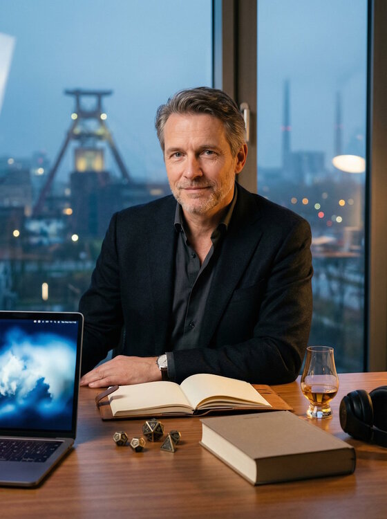 Als letztes habe ich ChatGPT 5.2 Pro versucht, allerdings kann ChatGPT 5.2 Pro keine Bilde erstellen, sondern nur Image Prompts. Also kam das folgende Image Prompt heraus: Photorealistic cinematic half‑body portrait of an original character: a German man in his early 50s, calm and confident with a kind, thoughtful expression, subtle smile, salt‑and‑pepper hair, neat light stubble, clear eyes. Outfit: well-fitted dark blazer, open‑collar shirt, minimalist watch. Setting: a clean modern workspace at dusk with soft warm interior light and cool window rim light. Through a large window behind him: a softly blurred Ruhr-area skyline with industrial silhouettes (a headframe shape and a distant chimney), scattered city lights, light mist. On the desk in the foreground (tasteful, not cluttered): a sleek laptop showing abstract cloud shapes/icons (no readable text), a leather notebook with blank pages, a set of polyhedral dice with a D20 visible, a hardcover sci‑fi book with an unbranded blank cover, over‑ear headphones, and a Glencairn glass with amber single malt whisky catching the light. Mood: quiet leadership, integrity, competence, warmth, grounded optimism. Shot style: 85mm lens look, shallow depth of field, realistic skin texture, natural color grading, subtle film grain, high detail, crisp focus on face, cinematic composition, high resolution.Den Prompt habe ich dann einmal durch Midjourney, einmal durch Flux 2.0 Max und einmal durch Google Nano Banana Pro gejagt. Midjourney (erstellt immer 4 Bilder, ich habe dieses gewählt, weil es einem meiner alten Schulkameraden erstaunlich ähnlich sieht) Flux 2.0 Max (für ein "Max" Modell finde ich die Fehler beachtlich: der Förderturm im Hintergrund ist leicht unrealistisch, Würfel sind nach wie vor ein Problem, man beachte das offene aber zugeklappte Buch, das Whiskyglas ist etwas zu groß) Google Nano Banana Pro (durchaus besser als Flux, aber immer noch mit kleinen Fehlern)