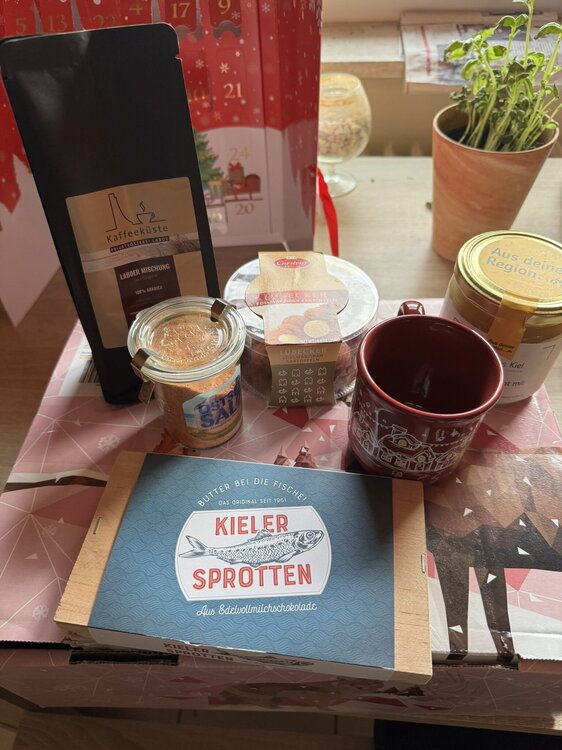 Dann beginne ich mal und bedanke mich bei meinem Wichtel für die Spezialitäten des Nordens, Kaffee, Ostseesalz, Sprotten-Schokolade, den leckeren Honig, die Mazipankartoffeln und die Weihnachtstasse. Ich habe mich sehr gefreut und werde mich daran gütlich tun.