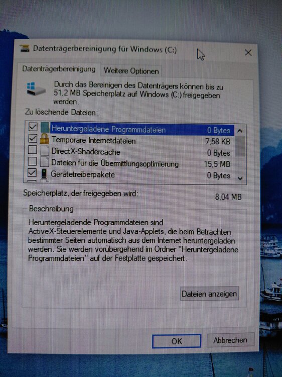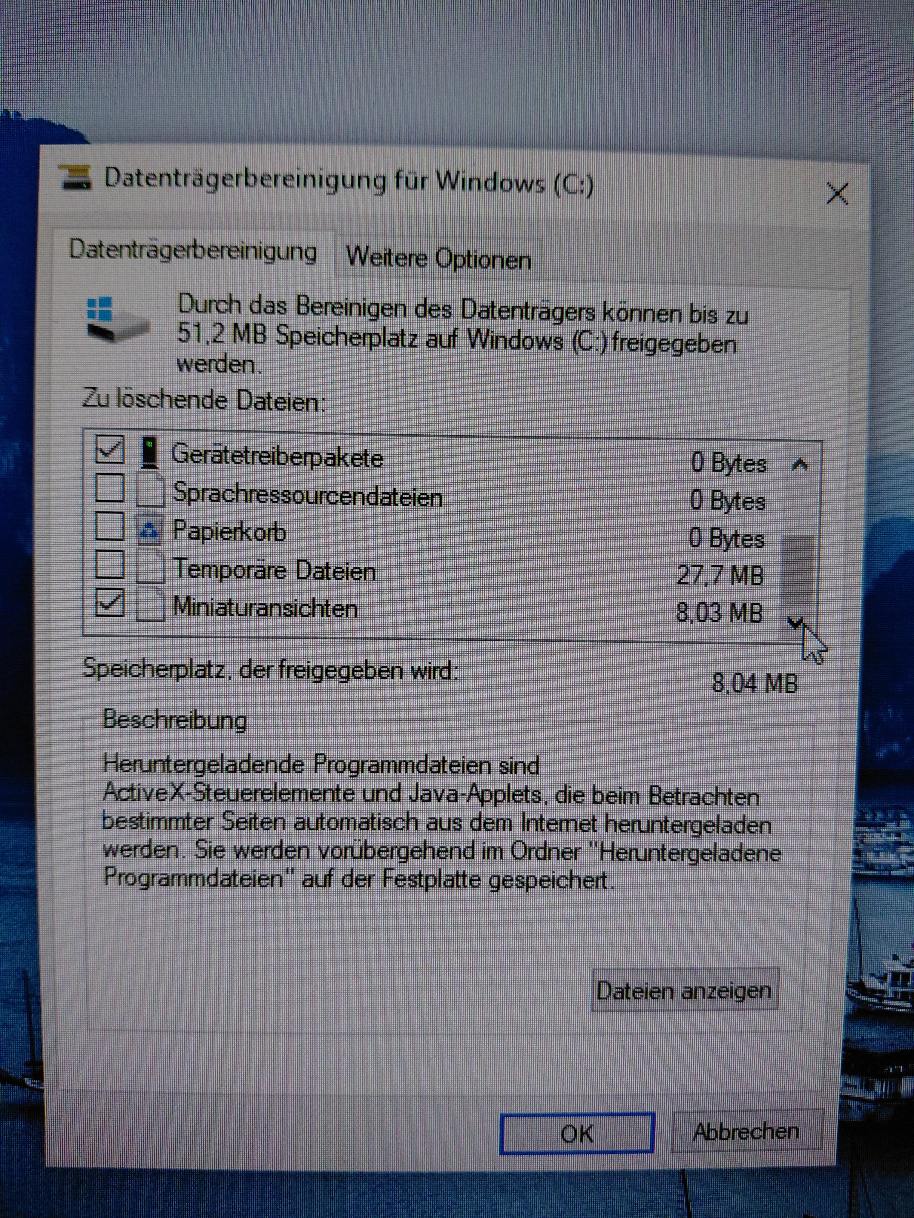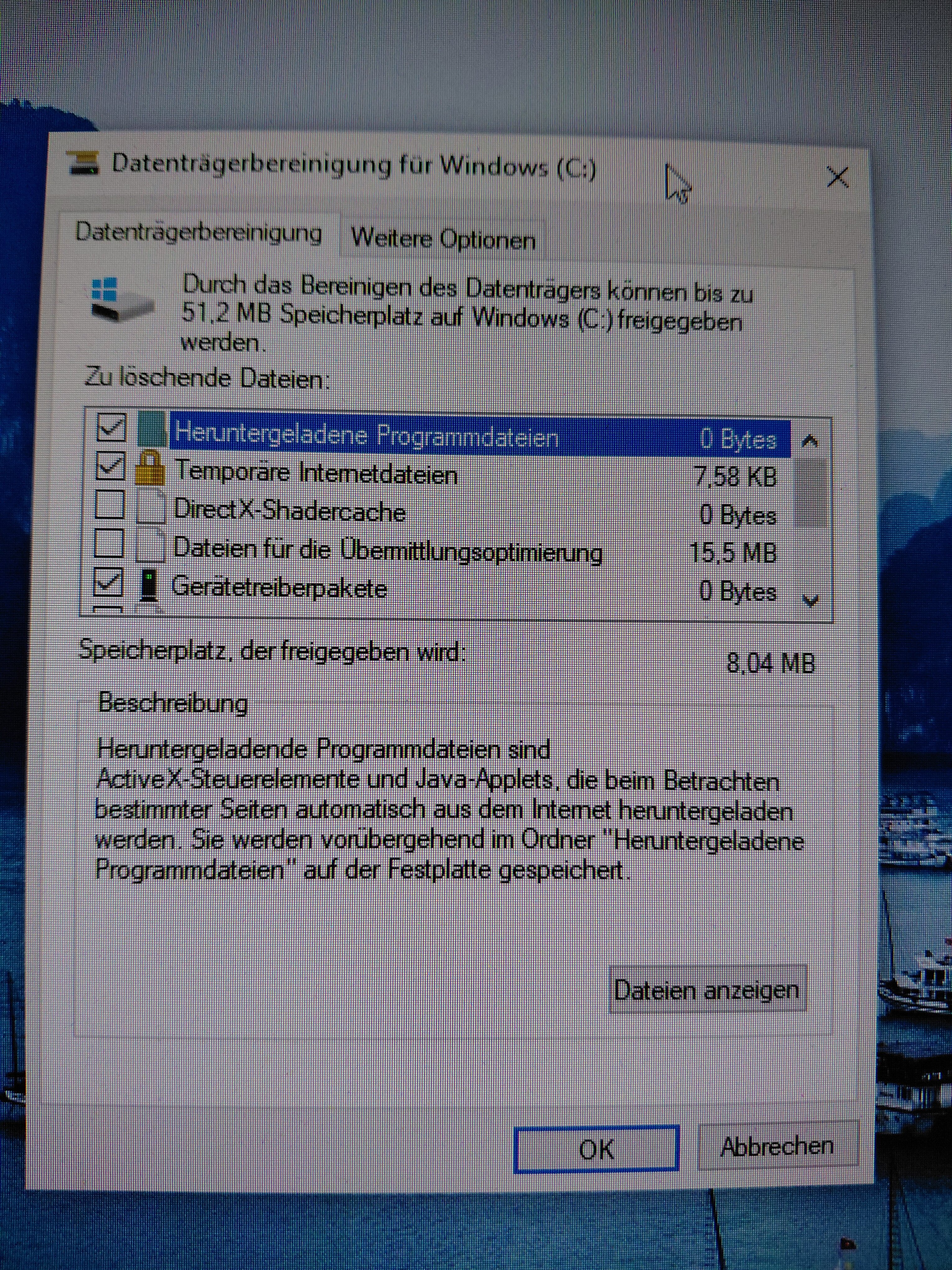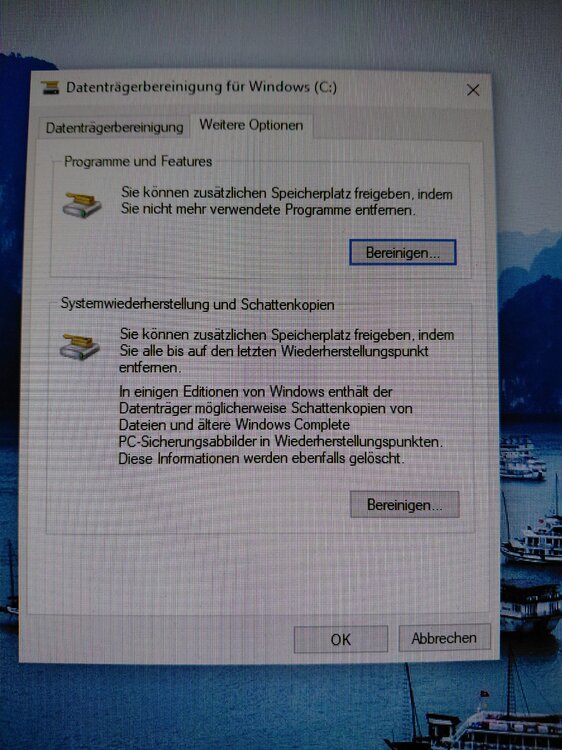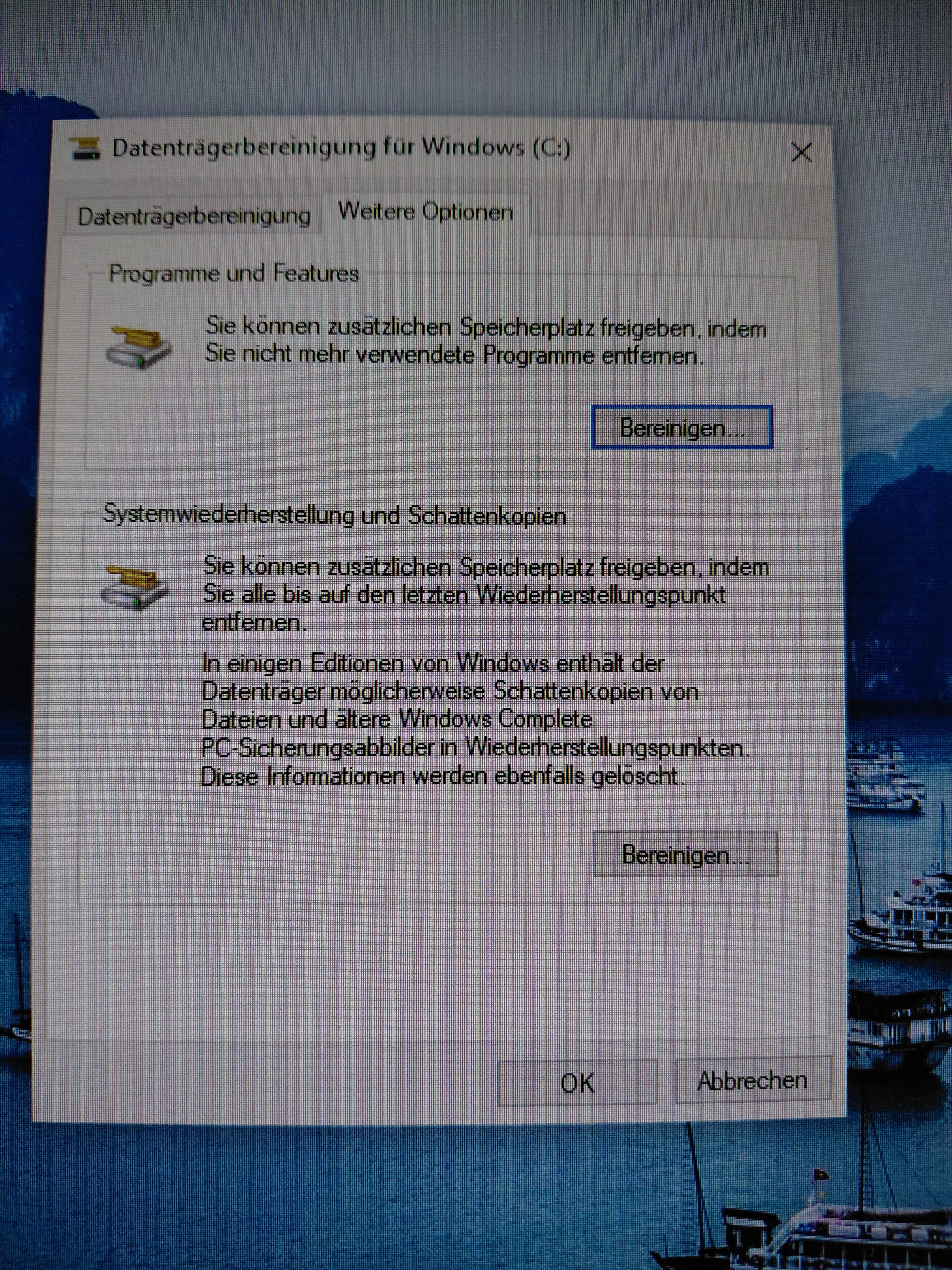 @Owen Nach dem Anklicken von "Systemdateien bereinigen" bietet er mir an: Da ist wohl nicht viel Speicherplatz zu holen. Daher habe ich mir angeschaut, was der Reiter "weitere Optionen" bringen könnte: Bei "Programme und Features" möchte ich nicht klicken, da es ja auch Programme geben kann, die zwar lange nicht verwendet wurden, aber trotzdem noch interessant sind. Bei "Systemwiederherstellung und Schattenkopien" bin ich skeptisch, was das bewirkt: "Systemwiederherstellung" klingt für mich so gefährlich wie "auf Werkseinstellung zurück setzen", also alles wieder jungfräulich aber auch alle Daten weg. Schattenkopien hingegen klingt für mich so, als wenn ich die nicht bräuchte. Von meinen Dateien möchte ich ja nur die jeweils letzte Speicherung (nicht alle zuvor jemals gemachten Speicherungen). ****** Ich klicke und bereinige lieber erstmal nichts, da das von Dir vorgeschlagene nach der PC Analyse kaum Erfolg bringen würde, aber immer die Gefahr besteht, dass was schief geht (da müsste der zu erwartende Gewinn höher sein). Aber vielen Dank für den Versuch !!!
