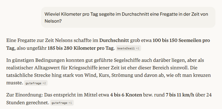 Ich habe mal die KI gefragt: 10 Knoten - das kam mir zunächst einmal ziemlich schnell vor. Ich hatte mal eine Phase, in der ich viel maritimes Zeug über die Zeit von Nelson/Napoleon gelesen habe. Im Fiction-Bereich u.a. die Serien Aubrey/Maturin von Patrick O'Brian sowie Horation Hornblower von C. S. Forester. Parallel und im Nachgang dann Non-Fiction zum Thema. War auch u.a. auf der HMS Victory in Portsmouth und der Batavia in Lillestad, letztere ein Nachbau eines holländischen Ostindien-Fahrers. Schon faszinierend! Für die napoleonische Zeit hatte ich 7 Knoten für eine Fregatte eher sehr schnell in Erinnerung, was - wenn man der KI trauen kann - auch wohl hinkommt. Geschwindigkeit allein sagt selbst natürlich noch nichts - selbst wenn man diese über 24 Stunden / Tag halten kann. Je nach Wind muß man ggf. Kreuzen. Hat man Raumwind, fährt man am Wind, was ist der Segelpunkt? Es gibt Meeresströmugen, Flauten, etc. pp. Bei Nacht kann man bei guter Sicht und brauchbarem Wind auch mit einfachen Mitteln ganz gut vorankommen - sofern es so etwas wie den Nordstern gibt. Gefährlich wird es ja nur dann, wenn man kein Wasser unter dem Kiel hat, also in der Nähe von Land. Im Grunde würde ich mir also gar nicht sooo viele Gedanken machen, wie viele Tage die Reise dauert, sondern schlichtweg einen groben Rahmen festlegen. Es scheint bei der Reise ja vorwiegend darum zu gehen, von A nach B zu kommen. Mit den "Durchschnittsgeschwindigkeiten" als Anhaltspunkt und einer "vorwiegenden Windrichtung" reicht eine grobe Kalkulation, gerade wenn man nicht jeden Tag der Reise tatsächlich "ausspielt". Wenn man den Kapitän des Schiffes zu Beginn der Reise sagen läßt: "Zu dieser Jahreszeit wird die Fahrt normalerweise zwischen 10 und 18 Tage dauern, hängt halt davon ab, wie stark wir in die Blabla-Winde geraten, die uns zum Kreuzen zwingen würden", wäre dies im Kopf der Spieler ja abgehakt. Dann blasen die "Blabla-Winde" eben "zufällig" genau so lange, daß die Reisedauer exakt der Zahl Tage entspricht, die Du von vornherein haben wolltest - laß es fürs Beispiel 15 sein. Liegt dann zwischen den vorhergesagten 10 bis 18 Tagen. Paßt. Falls sich jemand dafür interessiert, wie man wirklich praktisch Segelschiffe gehandhabt hat, für den dürfte "Seamanship in the Age of Sail - An account of the shiphandling of the sailing man-of-war, 1680-1860" von John Harland eine wahre Fundgrube sein. Um dies voll aufsaugen zu können, muß man allerdings sehr auf der Höhe sein, was die Seefahrtsbegriffe angeht, wo ich dann meine Grenzen gefunden habe. Trotzdem ein sehr aufschlußreiches Buch. Im Rollenspielbereich sind Seefahrts-Dinge meistens sehr "Pi mal Daumen", von Schiffsplänen über alles andere. In der Regel reicht das ja auch für die normalen Zwecke, wenn die Spielergruppe von A nach B will (vielleicht mit dem unausweichlichen Sturm oder Piratenüberall dazwischen). Wenn man Seefahrt aber als integraler Bestandteil einer Kampagne behandeln will, ist es schon schön, mehr als das zu haben. Als Regelwerke (nicht Abenteuer), die sich dezidiert mit Seefahrt befassen, kenne ich "Sea Law" für Rolemaster, was ich alles in allem eher mäßig fand. Sehr gut, brauchbar und praktisch prima verwendbar ist wieder mal etwas aus der Hârnmaster-Ecke, nämlich der "Pilot's Almanach". Der deckt inhaltlich so ziemlich alles ab, was man an Seefahrts-Zeug braucht. Francesco di Lardo