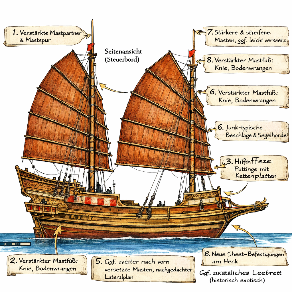 Das Dschunken-Rigg ist definitiv anders als eine Rahtakelung. Daher gibt es keine Stagen und eine entsprechende Verankerung mit einem Bugspriet. Der ausladenden Vorsteven (Galeon) dient in diesem Fall als Enterbrücke.