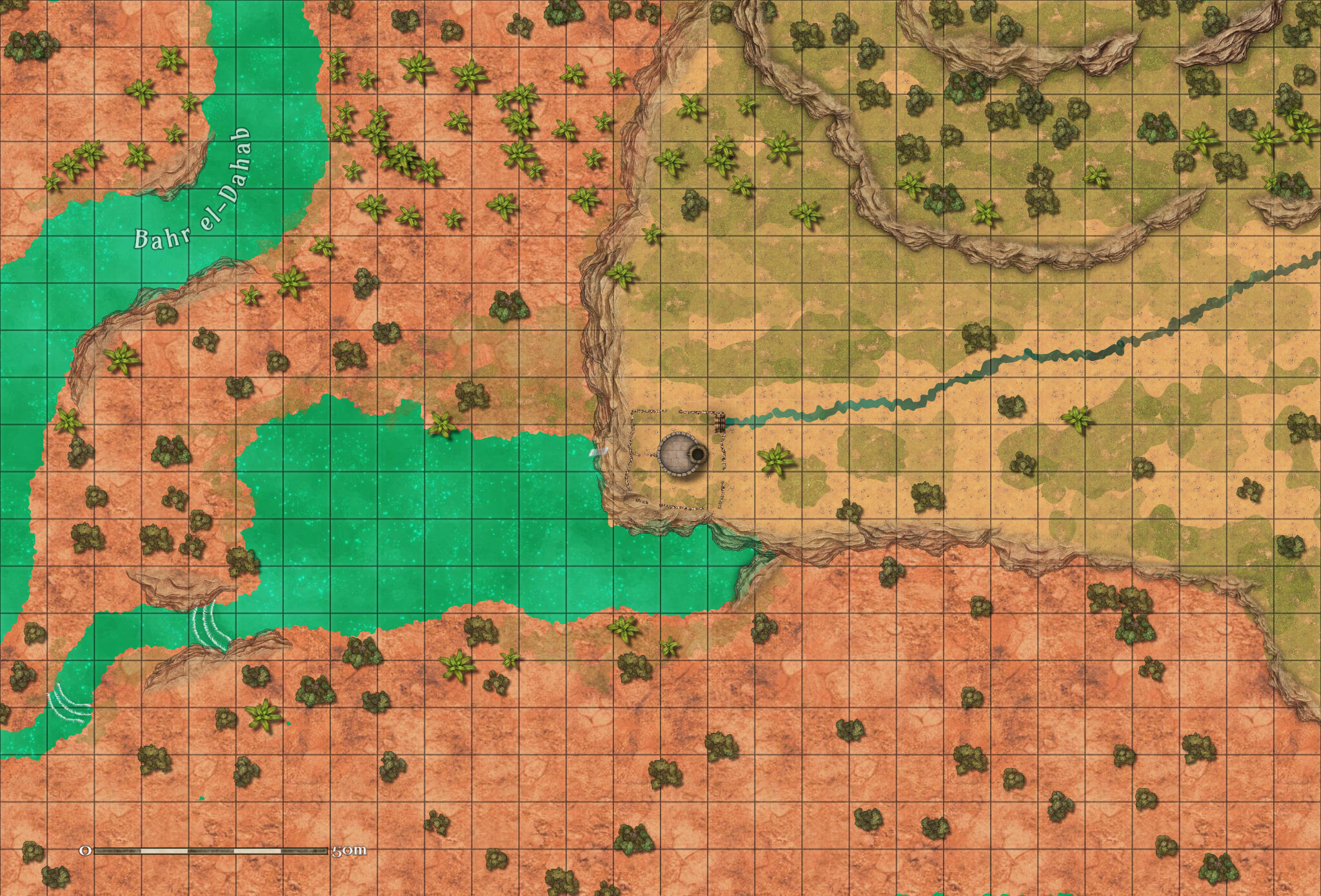 2. Eine Map im Rahmen unserer SüM-Kampagne. Zuhrad's Turm im südlichen Niemandsland der Dschebel-Alilat. Abweichend von dem Original schickt der Alte vom Berge /JaA Aufklärungseinheiten zu Zuhrad's Turm, die unmittelbar nach der Gruppe eintreffen. Noch ahnen die Abenteurer nichts von der Gefahr..