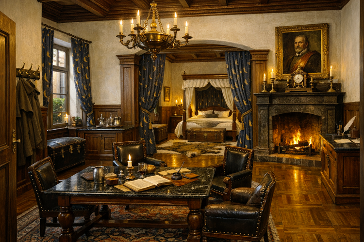 Ich habe mir eben mal ein Filmchen bei Youtube über DA angesehen. Schon beeindruckend, jedoch... ... diese Art von Tools wählt stets aus einem (wenn auch umfangreichen) Set von bestehenden Optionen aus. Ich kann also gerade nicht etwas aus meinen Beschreibungen erschaffen. Von der Methodik könnte man vielleicht hingehen, einen Raum mit DA erstellen, das Bild in ChatGPT füttern und dann Prompt-Anweisungen geben, ihn anzupassen. Diesen Ansatz habe ich tatsächlich einmal mit einem mit Incarnate erstellten Raum (Draufsicht mit Möbeln) probiert und ChatGPT gepromptet, es solle diesen Floorplan aus der Perspektive eines in der linken Ecke stehenden Menschen in einem bestimmten Stil darstellen. Das Ergebnis war bescheiden: Der "Grundriß" wurde nicht übernommen. Man konnte zwar nachvollziehen, daß er bestimmte Möbel übernommen hat, die Anordnung stimmte aber bestenfalls entfernt mit dem Grundriß überein. Mein ursprünglicher Ansatz war folgender: Bleistiftgrundrisse füttern, Textbeschreibung füttern, dann Raum darstellen lassen. Das Ergebnis aus Perspektive einer Person, die im Raum steht, läßt DA Welten hinter sich. Die Atmosphäre der Räume ist wunderbar getroffen und entspricht in Grundzügen der Textbeschreibung. Im Detail und in der Treue zu den zugrundeliegendnen Grundrissen läßt es jedoch zu wünschen übrig. Man merkt, daß ChatGPT "irgendwie" versucht hat, die Grundrisse zu verarbeiten - aber es schafft es nicht wirklich. Zur Illustration stelle ich einmal ein Beispiel hier ein: 1. "gefütterter" Grundriß 2. textbasierte Raumbeschreibung 3. Chat-GPT Resultat nach leichter Nachbearbeitung. Los geht's: Der "Bleistift-Grundriß" - old-school per Hand - mittig die "Viscount Suite" Die textbasierte Raumbeschreibung "16. Suite No. 8 – Viscount's Suite The 'Viscount's Suite' is supposedly the premier suite of the 'Brimming Chalice'. At least this is what nobles calling at the inn will be made to believe. And currently, with the 'Merchant's Suite' (14) permanently rented out, it is indeed the best suite available. In any case, it is fit for a travelling noble, though it is most often used by wealthy merchants. The 'Viscount's Suite' is double the size of the normal suites, half of the room designated as the sleeping area, the other half as a sitting room. There is a spacious passageway between the two areas, which can be separated by curtains or left open to give a more spacious impression. Access to the suite is gained through a door leading into the sitting room from the hallway. The suite's floor is covered with mahogany parquet, and the walls are paneled halfway up with the same wood. Above this, the walls are whitewashed, like the ceiling. A chandelier hanging from the ceiling in the sitting room and sleeping area provide ample illumination at night. In the center of the sitting room stands a heavy carved mahogany table with a polished black marble top, surrounded by four chairs and an armchair, all upholstered in black leather held in place by ornate brass rivets. The window opposite the door allows natural light to enter the room from the inner courtyard. Since the inner courtyard is well shielded form the noise of the city, the 'Viscount's Suite' is by far the most quiet of all. To the right of the window is a large open fireplace. A noble clock stands on the mantelpiece, and the gold-framed portrait of the city leader hangs above it. Dark blue tapestries embroidered with a pattern of golden crescent moons hang on the walls to its right and left, apparently alluding to Porto Crecente. An iron-bound chest with two locks is located near the window. One lock holds the chest firmly anchored to the floor, while the other locks the chest's lid. Polished brass coat hooks are mounted on the wall next to the door to hold guests' coats. To the right and left of the passageway to the sleeping area, there are sideboards with black marble tops with shelves set against the wall. The left sideboard contains porcelain and cutlery, and on the shelves there are several silver goblets and a carafe on a silver tray. The right sideboard is kept free for the guest's needs, apart from ink, paper and writing utensils. Passing through the doorway to the sleeping area, the first thing that catches the eye is a stately four-poster bed, whose snow-white sheets and pillows harmonize very well with the canopy and the curtains, which, like the tapestries on either side of the bed and the floor-length window curtains of the suite, as well as the tapestries on either side of the bed, are all of the same type as those in the sitting room. This gives the 'Viscount's Suite' a simple stately elegance. The fur of a large cat of prey is spread out on the floor in front of the bed, and there are two chests for clothes or other belongings next to each side of the bed. In the inner corner of the room there is a spacious wardrobe for the guest's clothing. Opposite, built into the corner, is a dressing table with a black marble top on which there is a mirror. In front of which one can see a chair covered in black leather and brass rivets in line with the style of the suite. Das Resultat: Fazit: Atmosphärisch meiner Ansicht nach wirklich sehr gut getroffen. Und der visuelle Eindruck ist um Welten besser, als alles, was man mit Dungeon Alchemist und derartigen Tools erreichen könnte. Der Kamin gehört dort aber nach Grundriß nicht hin. Die Fenster sind auf der falschen Seite. Dabei kann es sein, daß er meine Symbolik für "Tür" im Grundriß mit der für "Fenster" verwechselt hat. Die Grundriß-Symboliken könnte man der KI womöglich jedoch beibringen. Dort, wo im Bild die Tür gezeigt wird, ist auf dem Grundriß jedenfalls keine.