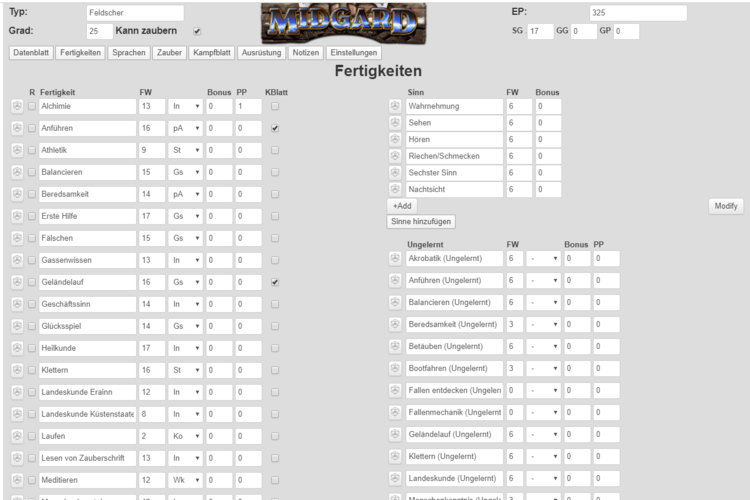 Kehre gerade nach einigen Jahren Pause zu Midgard zurück, aufgrund der Rahmenbedingungen mit Roll20. Den Bogen finde ich echt top! Eigentlich bin ich da kritisch und hab mir in der Vergangenheit immer meine eigenen Bögen gebastelt, aber die sahen dann so ähnlich aus wie dieser Roll20-Bogen ;-). Also absolut Daumen hoch und vielen Dank für die Arbeit! Eine Sache, die mir fehlt, ist eine Ausrüstungsliste mit Gewichten und Sektion "angelegte Rüstung" sowie entsprechend Gesamtgewicht und Belastung. Im Prinzip würde ich mir das so ähnlich vorstellen wie den Kampfbogen, mit einer Zeile je Ausrüstungsgegenstand. Rüstungen und Waffen würde ich separat auflisten, die Rüstungen könnte man mit dem Kampfbogen und dem "angelegt"-Button verknüpfen für die Belastung. Dazu noch eine Kategorie "Verbrauchsgegenstände" für Verbände, Munition, Rationen etc. und entsprechendem Zähler für den "Füllstand". Ist das etwas, was noch mehr Leute vermissen? Könnte das der Bogen noch lernen, entwickeln da noch jemand dran rum? Oder sind wir in unserer Gruppe die einzigen Bekloppten, die die Belastungsregeln so ernst nehmen, so dass der Weg da nur über Pro-Account und selber anpassen führt? Viele Grüße, Joachim P.S.: Und noch eine Sache, bei der ich nicht weiss, ob das umsetzbar ist... bei krit. Erfolg/Fehler sollte irgendwas im Chatfenster bimmeln, winken etc., der blassgrüne Rahmen bei kritischen Erfolgen ist mir da etwas wenig Fanfare^^