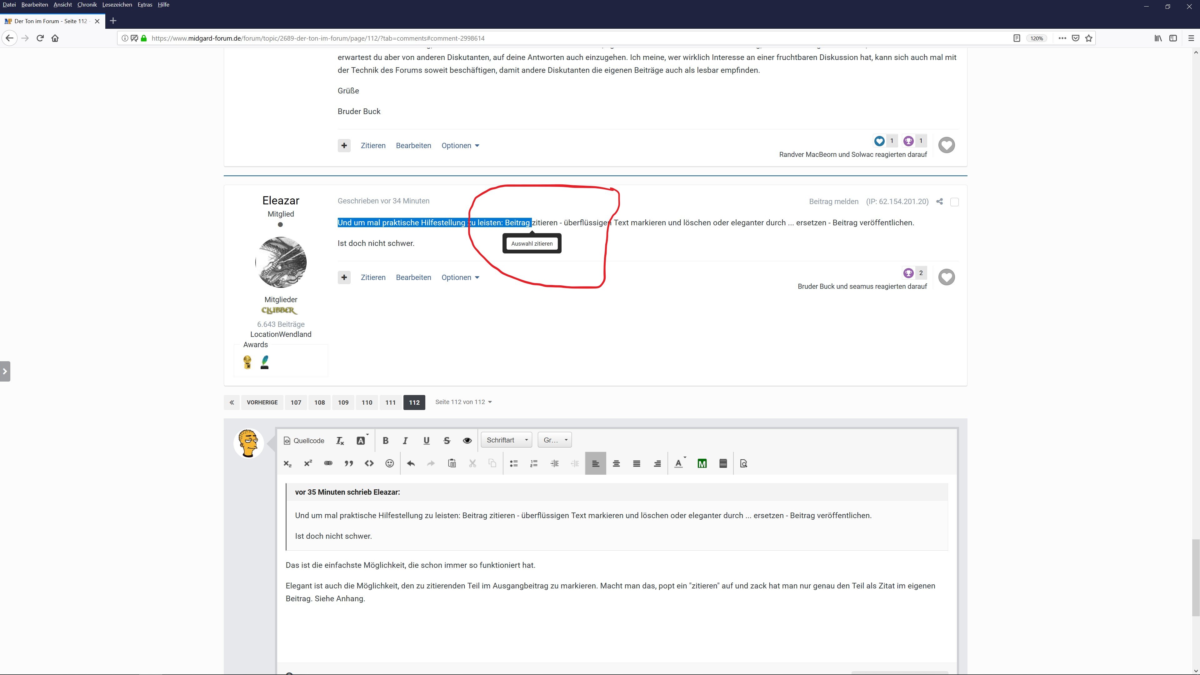 Elegant ist auch die Möglichkeit, den zu zitierenden Teil im Ausgangbeitrag zu markieren. Macht man das, popt ein "zitieren" auf und zack hat man nur genau den Teil als Zitat im eigenen Beitrag. Siehe Anhang.