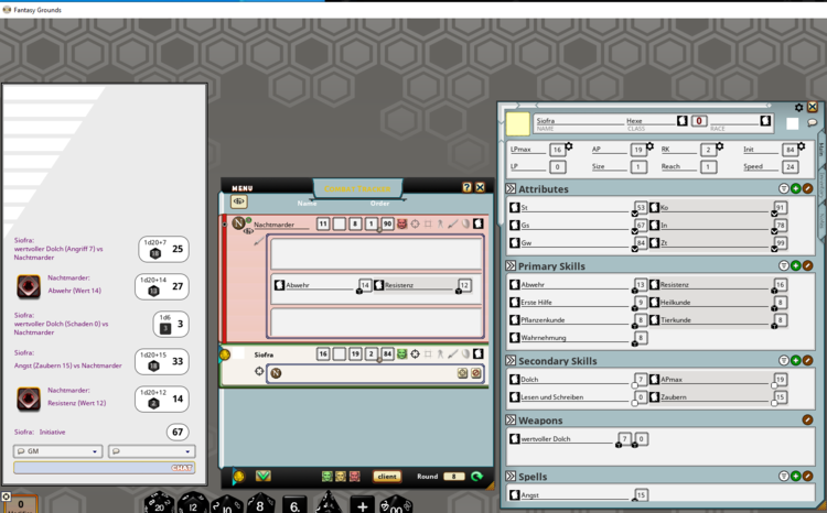 Das erweiterte Standard-Charaktersheet scheint sehr mächtig zu sein, damit sollte ich alle Funktionen eines Midgard-Charakters abbilden können. Ohne Automatismen wie den Gegner automatisch Abwehr würfeln zu lassen oder Zustände wie "panisch fliehend".
