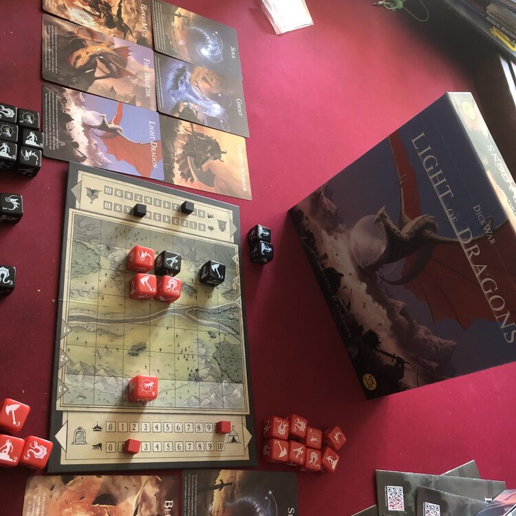 Heute haben wir auch DiceWar in der Basisvariante Light of Dragons gespielt. Ein Spiel mit Würfeln ganz ohne Glücksfaktor. Die Regeln sind in 10 Minuten erklärt. Ein reines Strategiespiel für 2 Spieler. Eine Partie dauert so zwischen 10 und 20 Minuten, außer ein Spieler braucht Ewigkeiten um sich zu entscheiden.