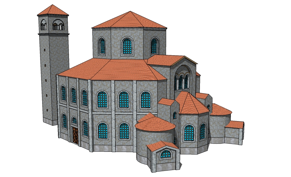Irgendein Teufel muss mich dann doch wieder geritten haben... :rolleyes: Jedenfalls konnte ich meine Finger nicht von SketchUp lassen und habe letzte Woche "mal eben" ein Modell der Basilika gezeichnet. Dem Ding dann gestern abend nach dem Con noch schnell ein paar geeignete Texturen verpasst. Hier das Ergebnis: